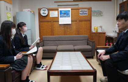 新転任の先生方にインタビューということで、文化委員会のお二人が校長室にやってきました。インタビュー内容は、校内放送を楽しみにしておいてくださいとのことです。