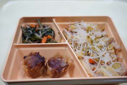 今日の給食は、炒めビーフン、揚げシュウマイ、ほうれん草ともやしのカツオ和え、ノリの佃煮、ごはん、牛乳です。揚げシュウマイはパリパリと食感もよく、とてもおいしかったです。