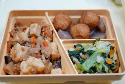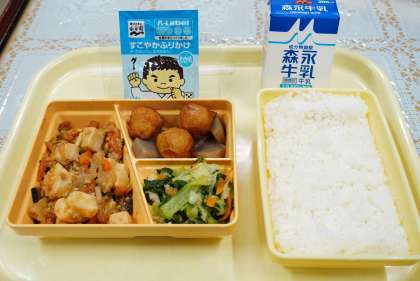 今日の献立は、麻婆豆腐、丸天の含め煮、チンゲン菜の炒め物、、ご飯、ふりかけ、牛乳です。小学校給食の麻婆豆腐よりもしっかりした味付けで、ご飯がとても進みました。