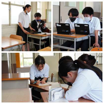 写真は朝の自主学習風景です。自主学習でタブレットを活用する姿も多く見るようになりました。
