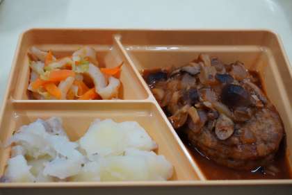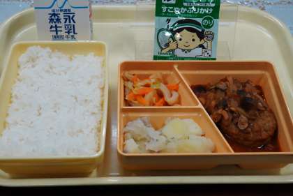 今日の献立は、デミグラスハンバーグ、ジャーマンポテト、野菜炒め、ご飯、ふりかけ、牛乳です。