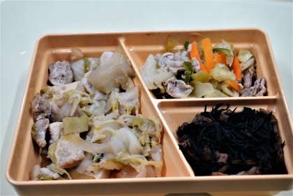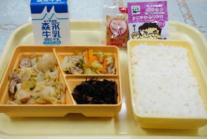 今日の献立は、鳥すき焼き風煮込み、ひじきの煮物、しゃぶしゃぶ風サラダ、ご飯、胡麻ドレッシング、ふりかけ、牛乳です。