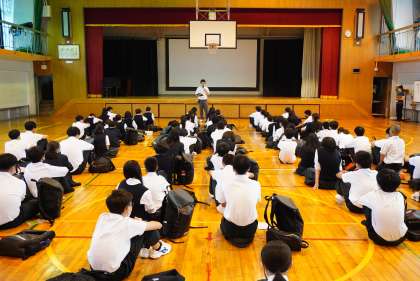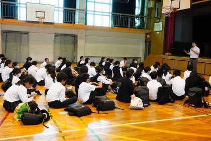 明日の宿泊行事に向けて、学年の先生から最後の話を聞く2年生です。