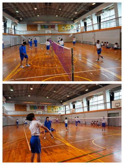 体育の授業を撮影しました。男子はバドミントンです。盛り上がっています。