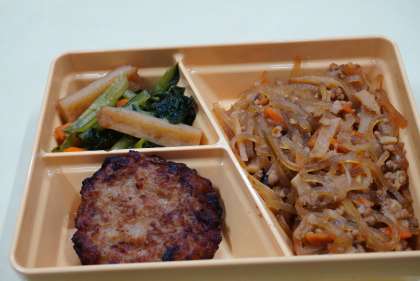 今日の献立は、マーボー春雨、キャベツ入つくね揚げ、小松菜の煮びたし、ご飯、海苔、牛乳です。