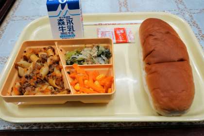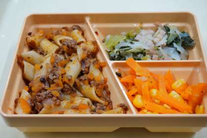 今日の献立は、ハニーパン、ミートペンネ、インゲン際の炒め物、ニンジンサラダ、牛乳、ミルメークです。