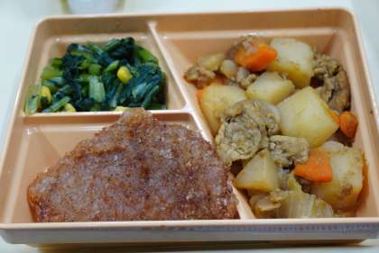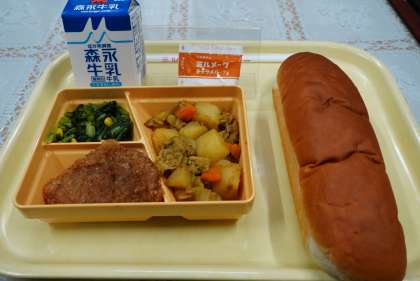 今日の献立は、ジャガイモのインド風煮、小松菜とコーンの炒め物、米粉ハムカツ、コッペパン、ミルメーク、牛乳です。