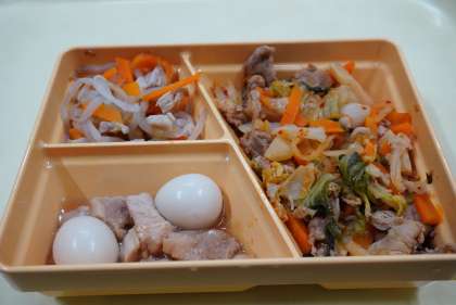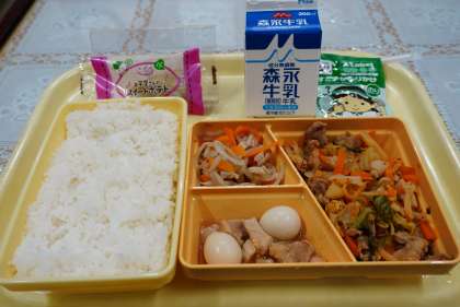 今日の献立は、スタミナ炒め、鶏肉と鶉卵のうま煮、もやしのサラダ、ふりかけ、スイートポテト、ご飯、牛乳です。