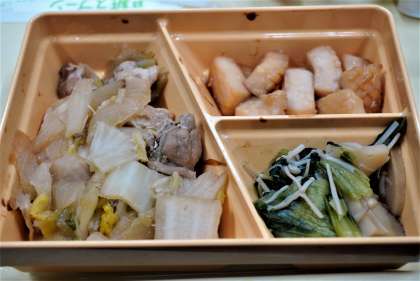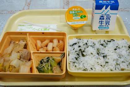 今日の献立は、鶏すき焼き煮こみ、チンゲン菜とえのきの和え物、イカの照りに、わかめご飯、ミカンゼリー、牛乳です。