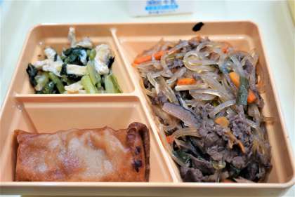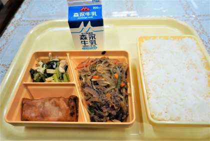 今日の献立は、チャプチェ、ご飯、春巻き、小松菜のシラス和え、牛乳です。チャプチェをご飯にかけて食べると、とてもおいしかったです。