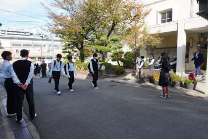 今朝の登校風景です。菊葉会役員の皆さん、今日もあいさつ運動をしっかり取り組んでくれて感謝します。