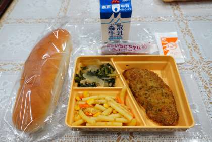 今日の献立は、アジの磯部フライ、マカロニサラダ、ベーコンとほうれん草の炒め物、コッペパン、ノンエッグマヨ、イチゴジャム、牛乳です。