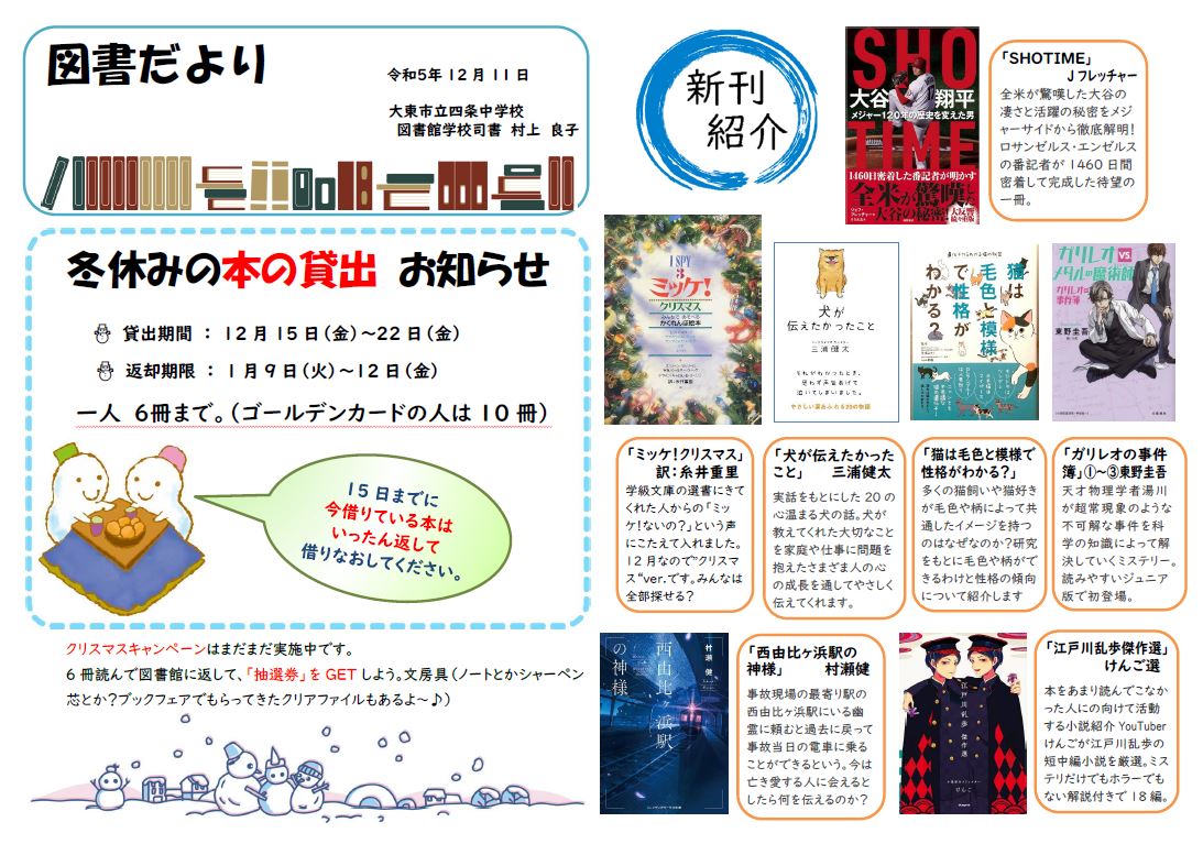 図書だよりを発行しました。今回は冬休みの本の貸し出しについてです。