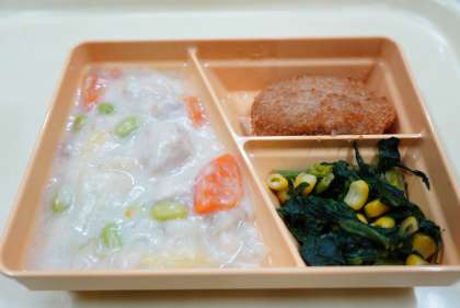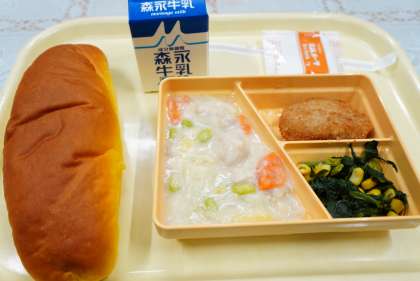 今日の献立は、パンプキンパン、白菜のクリーム煮、ミンチカツ、ポパイコーンソテー、ミルメーク、牛乳です。