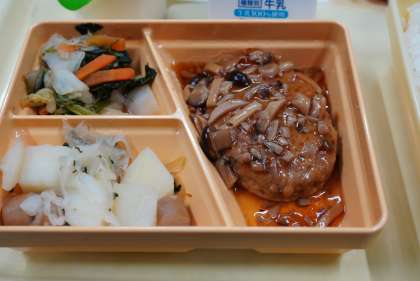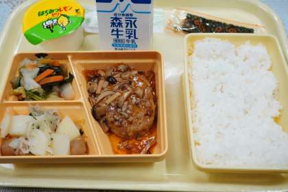 今日の献立は、照り焼きハンバーグ、じゃがソーセージ、カツオ和え、のり、ご飯、牛乳、はちみつレモンぜりーです。