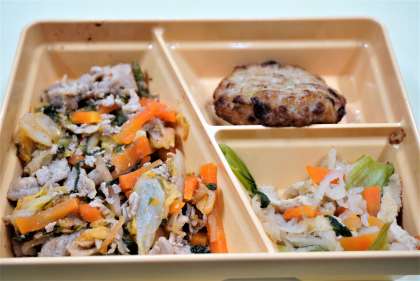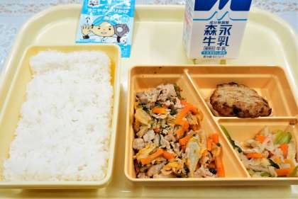 今日の献立は、ご飯、豚キムチ、キャベツ入りつくね揚げ、切干の和え物、ふりかけ、牛乳です。