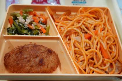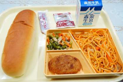 今日の献立は、コッペパン、スパゲティナポリタン、挽肉と小松菜のにんにく炒め、コーンコロッケ、イチゴジャム、ミルメーク、牛乳です。