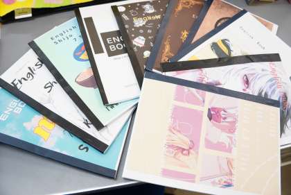 英語科の先生に見せていただきました。3年生がそれぞれ最後に作成した作品です。