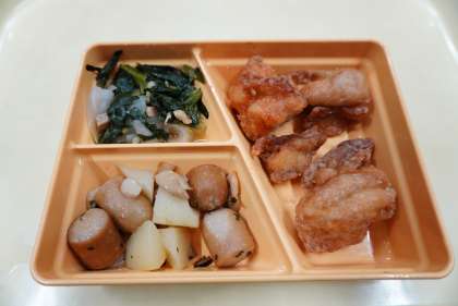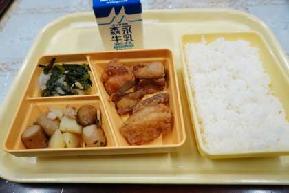 今日の献立は、ご飯、鶏の唐揚げ、ソーセージときのこのアヒージョ風、ベーコンとほうれん草の炒め物、塩昆布、牛乳です。
