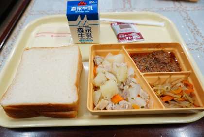 今日の献立は、食パン、洋風含め煮、ミートサンド、スライスチーズ、もやしのカレー和え、牛乳、ミルメークです。