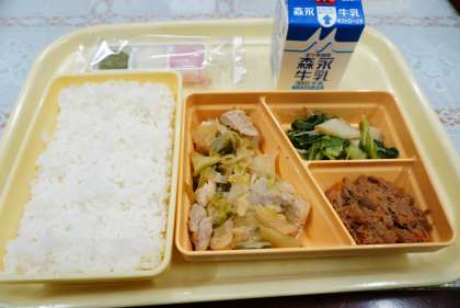 今日の献立は、ご飯、とりすき焼き風煮込み、チンゲン菜とえのきの和え物、かつおそぼろ、花見団子、牛乳です。