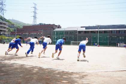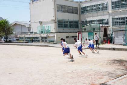 2,3組の体育です。今日は50メートル走のタイムを計っています。