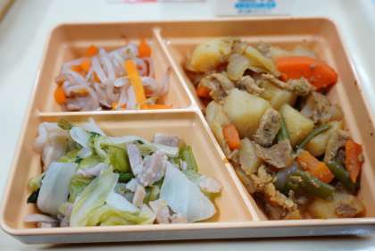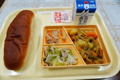 今日の献立は、和三蜜パン、ジャガイモのインド風煮、チンゲン菜の炒め物、もやしの和え物、ミルメーク、牛乳です。