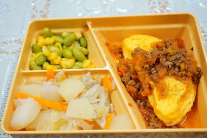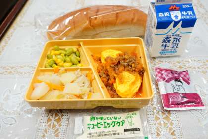 今日の献立は、コッペパン、オムレツミートソースかけ、ポテトサラダ、枝豆コーン、ノンエッグマヨ、チョコレートクリーム、牛乳です。