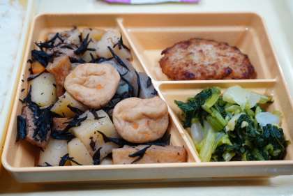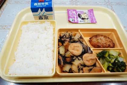今日の献立は、白ご飯、いそ煮、小松菜の和え物、キャベツ入りつくね揚げ、牛乳、ふりかけです。