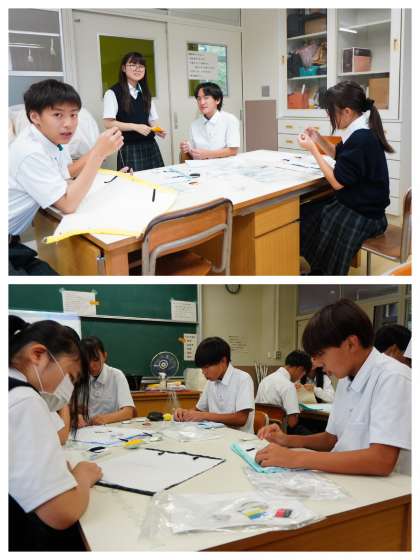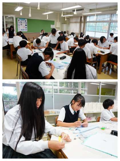 2年2組の家庭科です。ティッシュケースを作っています。