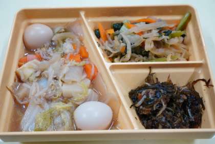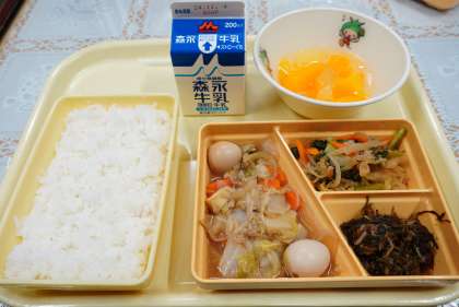 今日の献立は、ご飯、八宝菜、切干の和え物、佃煮ふりかけ、フルーツ寒天、牛乳です。