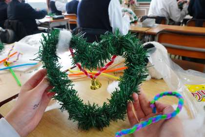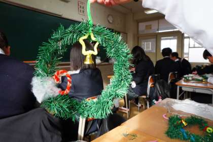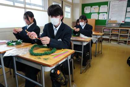 家庭科の授業です。クリスマスリーフを作っています。