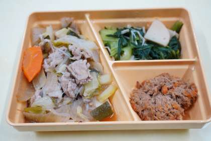 今日の献立は、ご飯、豚肉のすき焼き風、チンゲン菜とえのきの和え物、かつおそぼろ、牛乳です。
