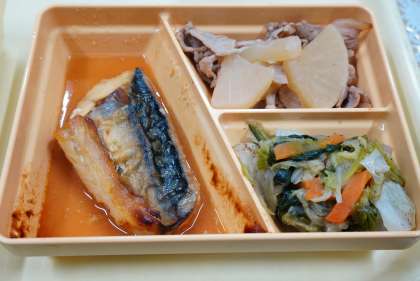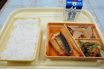 今日の献立は、ご飯、鯖の味噌煮、豚肉と大根の煮物、かつお和え、牛乳です。