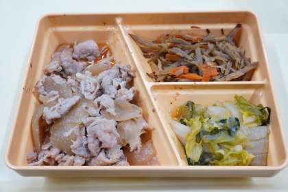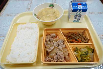 今日の献立は、ご飯、豚肉のしょうが炒め、きんぴらごぼう、おひたし、かきたま汁、牛乳です。