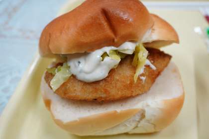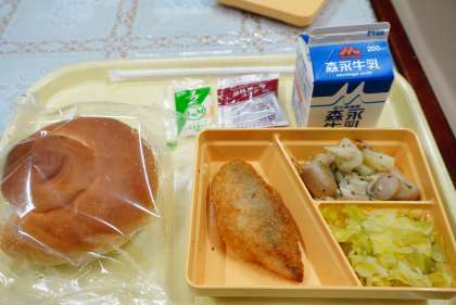 今日の献立は、バーガーパン、サーモンフライ、ソーセージときのこのアヒージョ風、キャベツソテー、タルタルソース、牛乳、ミルメークです。