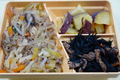 今日の献立は、ご飯、春雨のひき肉炒め、ひじきの煮物、さつまいもの甘煮、ふりかけ、ヨーグルト、牛乳です。