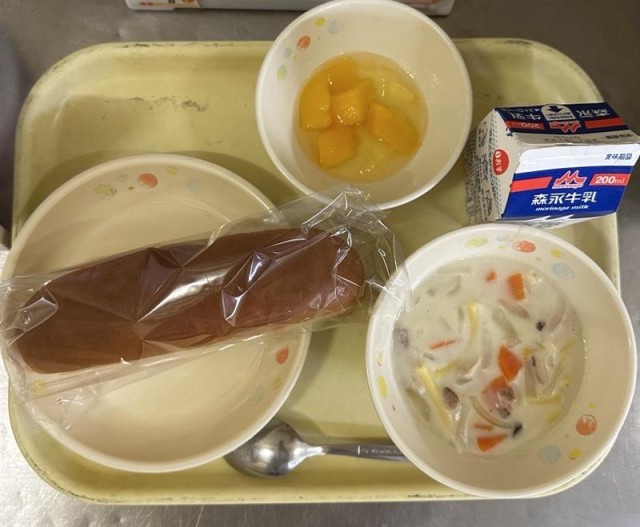 今日の給食は、ハニーパン・ホワイトシチュー・ももカクテル・牛乳でした。