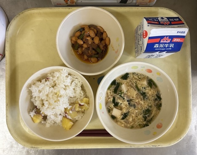 今日の給食は、さつまいもごはん・豚たま汁・五目豆・牛乳でした。
