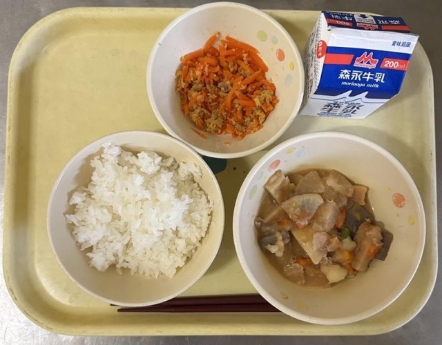 今日の給食は、ごはん・みそおでん・にんじんしりしり・牛乳でした。
