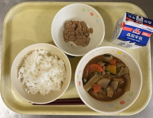 今日の給食は、ごはん・ほうとう・シーチキンのそぼろ煮・牛乳でした。