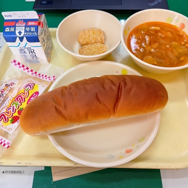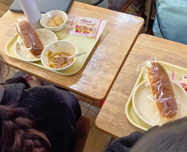 23日は2学期最後の給食でした。クリスマスイブイブということで、クリスマス風にミネストローネスープやチキンナゲットやハニーパン、そしてデザートのクレープには子どもたちも大喜びでした。