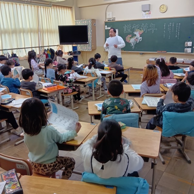 始業式のあとの各クラスでは、先生の力作黒板アートの前でしっかりお話を聞く姿がありました。他のクラスでは冬休みに宿題ではなかった学習をやった人が大勢いて、他のクラスメイトが拍手をおくっているいる微笑ましい場面もありました。