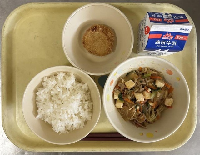 今日の給食は、ごはん・とうふのチャンプル・いかメンチカツ・牛乳でした。