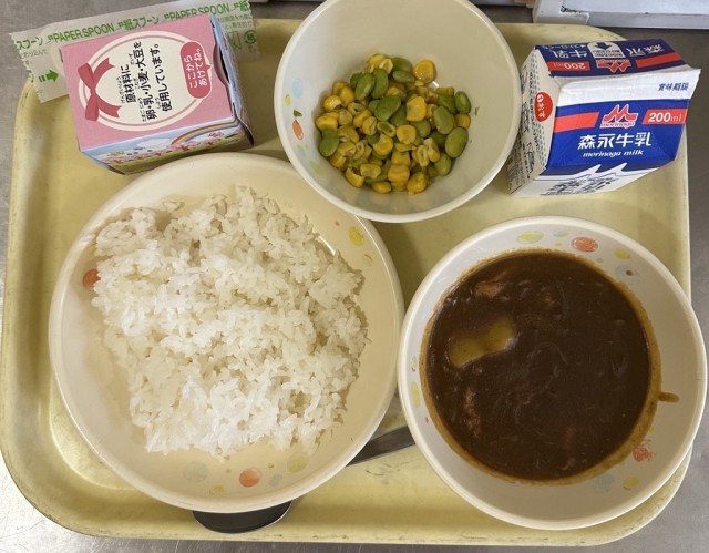 今日の給食は、ごはん・米粉ポークカレー・枝豆コーンソテー・卒業デザート・牛乳でした。