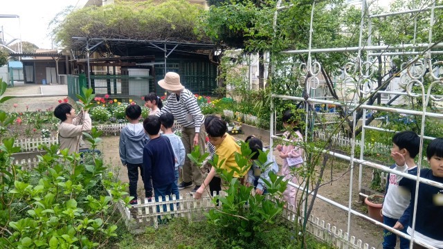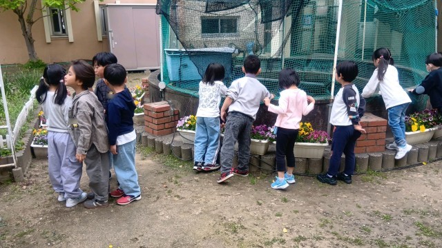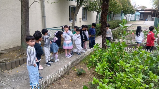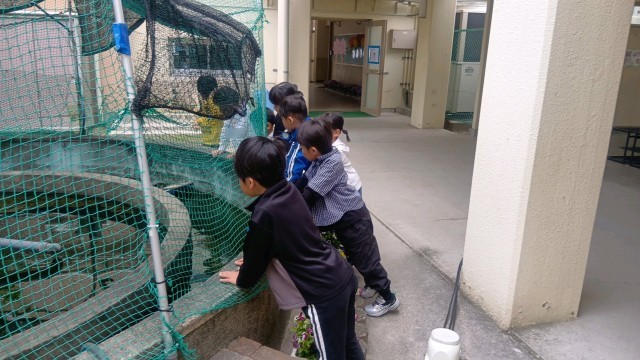 今日はお外で日直写真を撮っていました。待っている間、四条北小のきれいな中庭をのんびりとみていました。