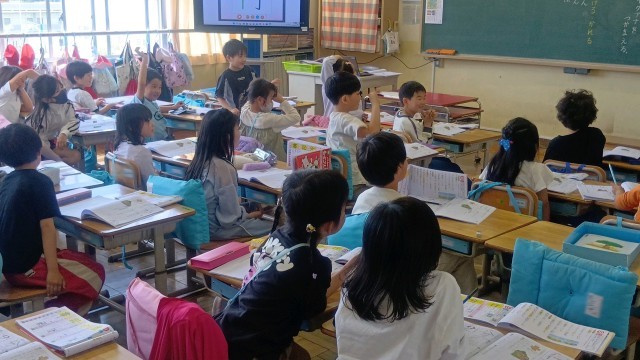 新出漢字「行」を学習していました。先生が行の付く言葉を聞いていると「ぎょうざ!」といった子の明るいノリに先生はアートで乗っかっていました。クラスが明るい雰囲気に包まれています。
