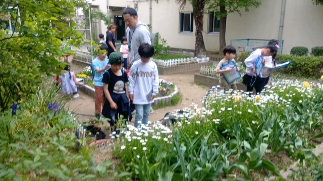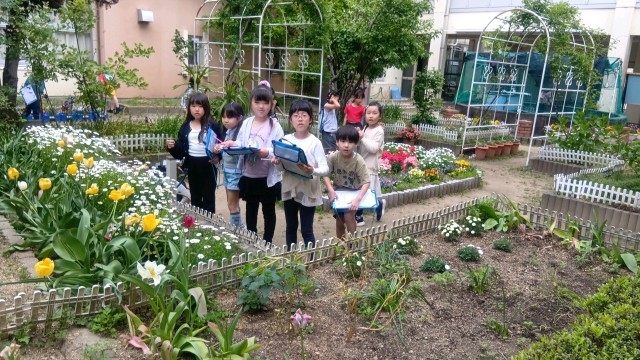 生活科の時間、春探しをしていました。四条北小の中庭はきれいな花でいっぱいなので、いろんなお花や生き物がたくさんいます。