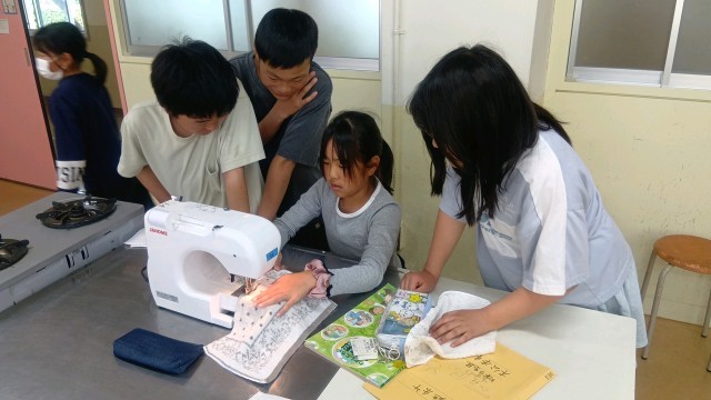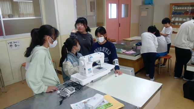 家庭科の時間、ミシンを扱っていました。楽しいリズムに乗って糸をかける練習から始めていました。