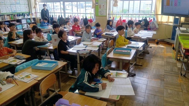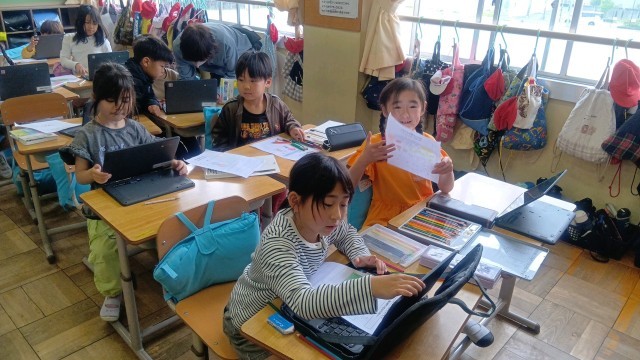 昨日観察した春の生き物をタブレットPCで調べていました。かわいい蜂のイラストに心が和みます。